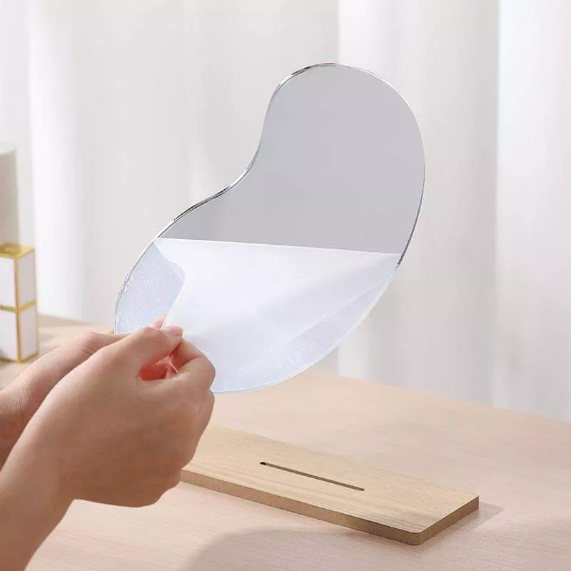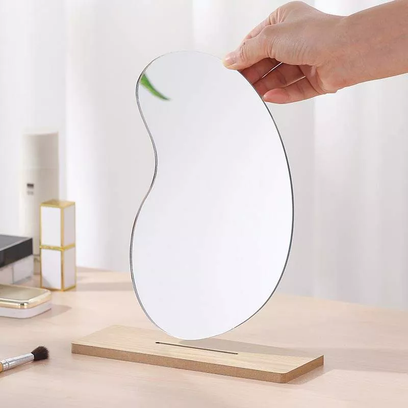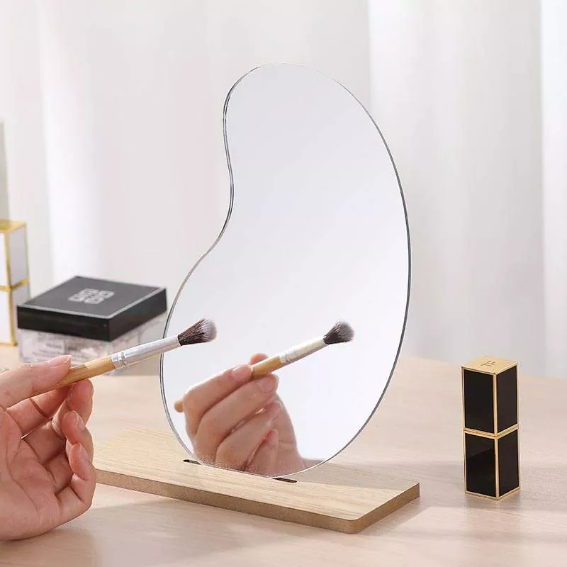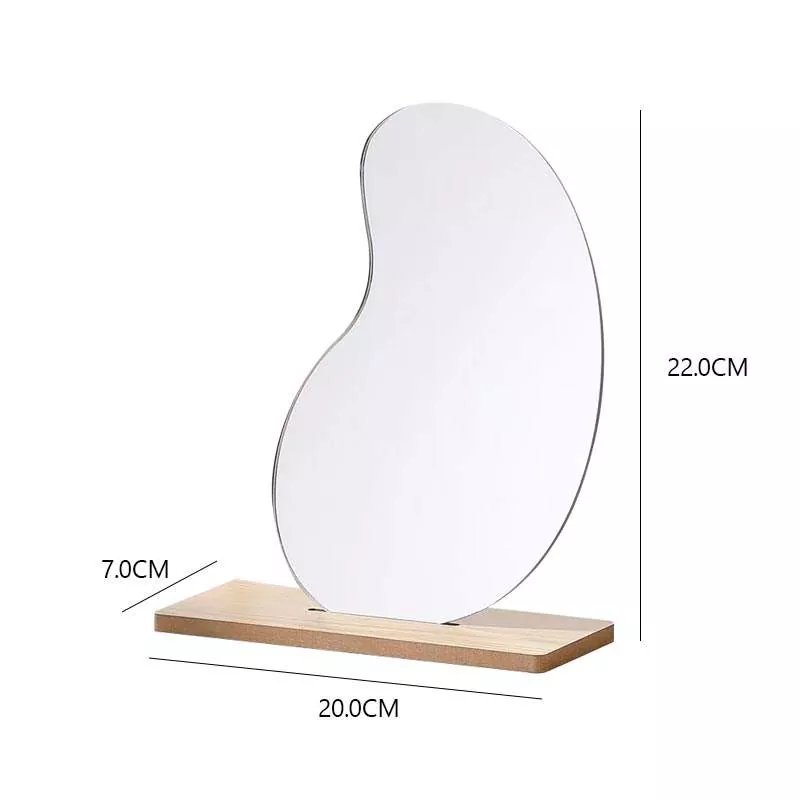 Ова неправилно брановидно огледало на маса се одликува со минималистичка, уметничка силуета која беспрекорно се вклопува со модерен домашен декор. Изработен со проѕирно стакло со висока дефиниција и мазна дрвена основа, дава рефлексија без изобличување, идеален за нанесување шминка, рутини за нега на кожата и секојдневно дотерување.