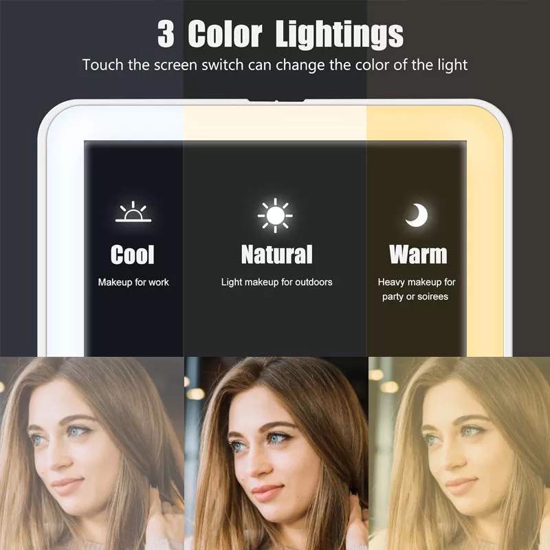 Ова огледало за шминка со LED на маса има три прилагодливи режими на светлина (ладно, природно, топло) за да одговараат на сите сценарија за шминка. Ладното светло е идеално за работна шминка, природното светло за надворешниот изглед и топлото светло за вечерните настани. Мекиот LED прстен без треперење обезбедува вистинско прикажување на боите, обезбедувајќи прецизна примена на шминка дури и во затемнети средини.